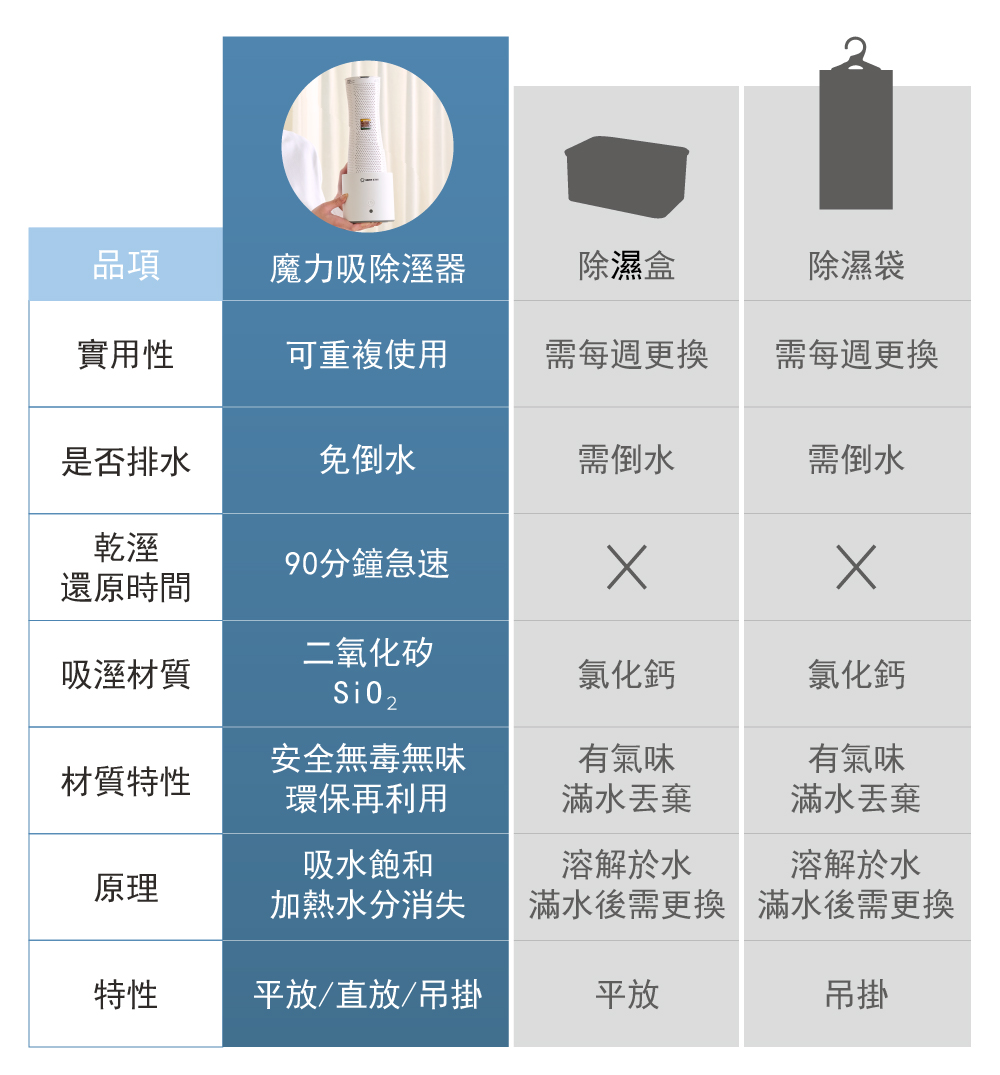 • 透視窗設計,輕鬆辨別吸溼狀況;飽和後無需倒水