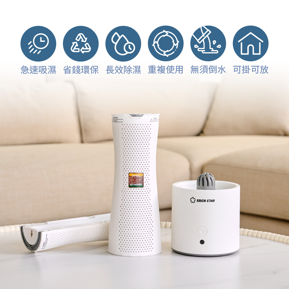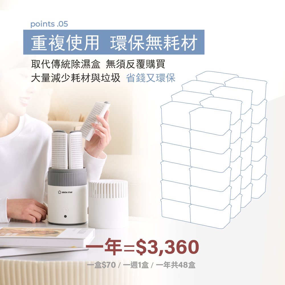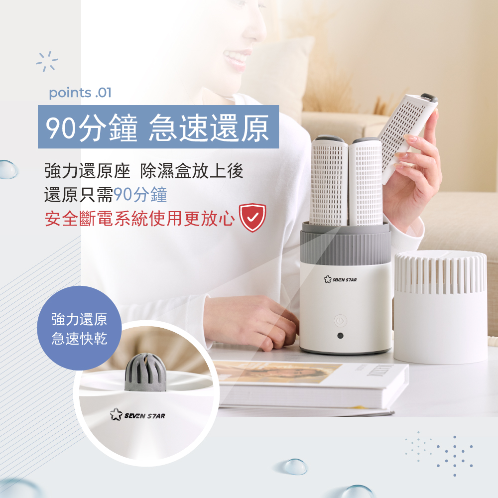 • 使用還原座還原除溼盒後即可重複使用,省錢環保無耗材