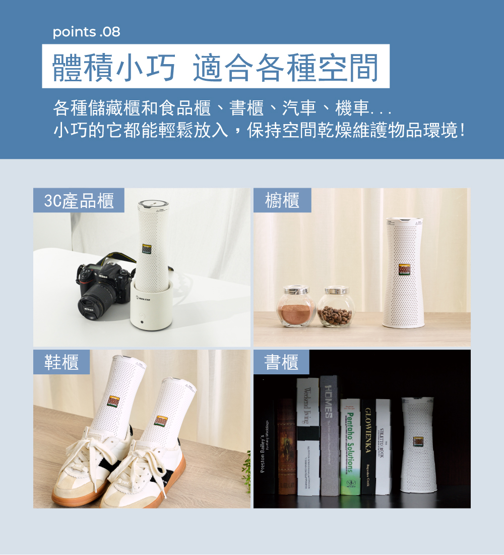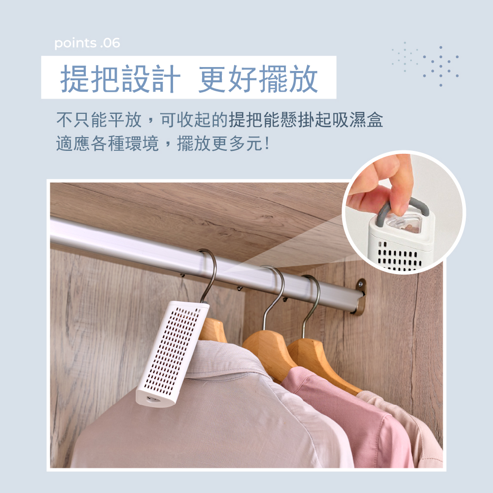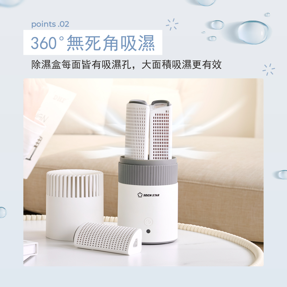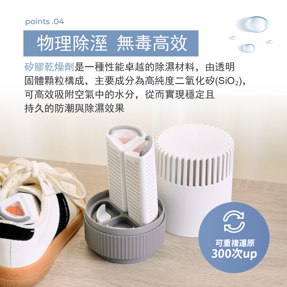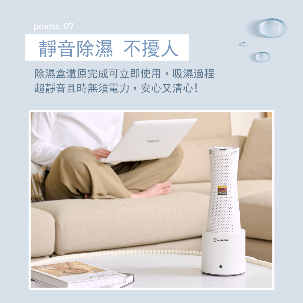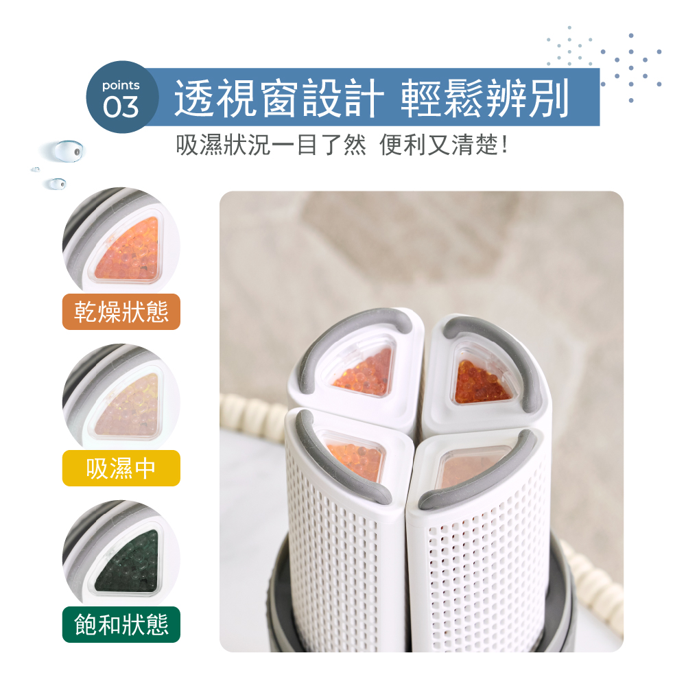 • 360° 都有吸溼孔,無死角吸溼,除溼過程無須電力,靜音除溼