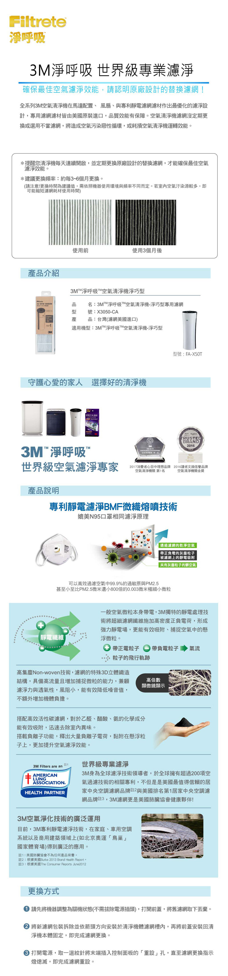3M 淨巧型空氣清淨機活性碳濾網X3050-CA ◆FA-X50T/FA-X30淨巧型專用濾網 ◆3M獨特靜電濾網濾淨技術 ◆N95防護口罩濾淨原理高效過濾 ◆PM0.003微米微粒也可過濾 ◆搭配活性碳有效除臭 ◆濾網材質為3M美國原裝進口 ◆內含FA-X50T/FA-X30淨巧型空氣清淨專用活性碳濾網一片 ◆採用3M獨特靜電濾淨技術,以N95防護口罩同樣的濾淨原理高效過濾室內空氣 ◆有效過濾空氣汙染中嚴重危害呼吸道健康的PM2.5細懸浮微粒、塵埃、花粉、塵蹣等過敏原與帶菌微粒。甚至比PM2.5還小800倍的PM0.003微米微粒也可過濾 ◆含活性碳,可有效降低空氣中之異味 ◆可連續使用2,160個小時,以平均一天使用12小時,約可使用6個月 ★本商品一經拆封使用,除產品本身瑕疵,恕無法辦理退貨★ ◆濾網型號:X3050-CA ◆適用機型:FA-X50T / FA-X30 ◆尺寸:33 x 11.7 x 4.4 cm ◆重量:600 g ◆國際條碼:4710367434849 ◆產地:台灣 (濾網材質自美國進口) ◆效期:3年