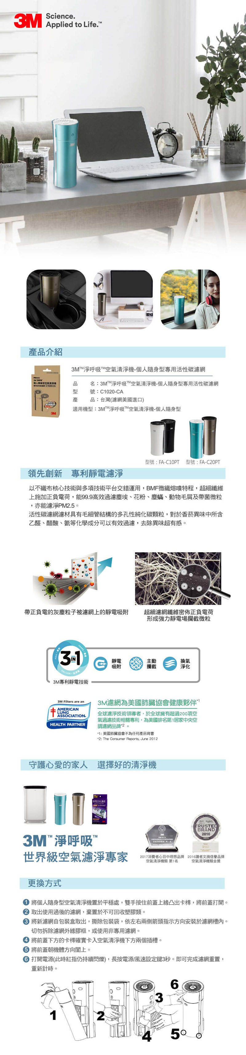 3M 淨呼吸個人隨身型空氣清淨機專用活性碳濾網(二入組) ◆內含FA-C10PT/FA-C20PT個人隨身型空氣清淨機專用活性碳靜電濾網四片 ◆能徹底捕捉空氣中99.9%以上塵埃、花粉、塵蹣、寵物毛屑等過敏原與病菌 ◆3M專利靜電空氣濾網技術,強力濾除空氣中之污染物 ◆活性碳濾網濾材具有毛細管結構的多孔性純化碳顆粒,對於香菸異味中所含乙醛、醋酸、氨等化學成分可以有效過濾,去除異味超有感 ◆比PM2.5還小800倍的PM0.003微米微粒也可有效過濾 ◆濾網建議一般使用時間為800小時,超過就需更換 ◆濾網材質為3M美國原裝進口 ★本商品一經拆封使用,除產品本身瑕疵,恕無法辦理退貨★ ◆內容物:活性碳濾網四片 ◆濾網型號:C1020-CA ◆適用機型:FA-C10PT / FA-C20PT ◆濾網尺寸(單個):(高*寬*深) 60*41*30 mm ◆包裝尺寸(四入):(高*寬*深) 90*170*40 mm ◆濾網重量(單個):33 g ◆包裝重量(四入):132 g ◆國際條碼:4710367435402 ◆產地:台灣 (濾網材質自美國進口) ◆效期:3年