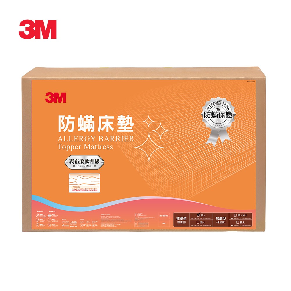 3M MIT防蹣床墊-低密度標準型(單人/雙人可選) ◆德國進口防蹣表布 ◆立體包覆,密合曲線 ◆高密度氣孔,絕佳透氣 ◆人體工學,均衡釋放體壓 ◆通過SGS/Intertek/TTRI紡研所檢測 ◆獲環保認證,低過敏性適用度高 ______________________________________________________________________________________________________- 表布 ◆100%防蹣:台灣在地研發生產,有效阻隔塵蹣。 ◆100%透氣:物理編織技術製成,常保舒適透氣。 ◆100%安全:符合歐盟物質安全標準,非化學性防蹣。 ◆國際級認證 *通過SGS檢測,符合REACH標準不含歐盟公告SVHC高度關注物質。 *通過Intertek檢測,符合國家標準,不含可遷移螢光物質或甲醛等有害物質。 *通過TTRI紡研所塵蹣阻隔測試,100%物理性防蹣。 床墊 ◆3M防蹣床墊主要是由聚酯胺材質製成,經實驗後加強局部釋壓點,讓你睡眠中放鬆又舒適。 ◆3M經過測試研發產品,均不含任何會破壞臭氧層的化合物成分,製程採用最先進的低廢料模具成型技術,通過國際標準,以及歐盟RoHS無重金屬測試。 ◆本產品材質為中密度聚酯氨發泡棉,長時間臥躺會擠壓易變形,建議使用1-2年後進行更換新床墊。 ★注意事項 使用本產品時,建議搭配純棉床包套使用,最外層的防蹣床包可拆下清洗,但請務必將床套反過來,並套上洗衣袋清洗,若出現毛毬實屬正常現象,不影響防蹣功能。 ★本商品屬個人用品,一經拆封使用,恕無法辦理退貨★ ◆包裝尺寸:單人64 x 14 x 90 cm / 雙人64 x 14 x 150 cm ◆商品尺寸:單人90 x 182 x 4 cm / 雙人150 x 186 x 4 cm ◆重量:單人1.7 kg / 雙人2.2 kg ◆產地:台灣