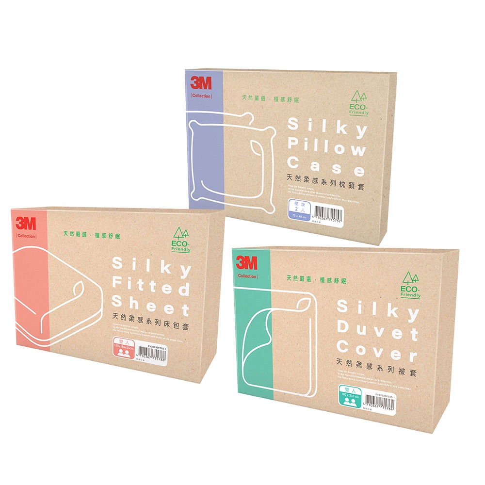 3M Collection 天然柔感系列-天絲床包被套四件組(雙人/雙人加大)任選 ◆天然天絲材質,柔順親膚 ◆輕盈舒適,透氣不悶熱 ◆濕氣+溫度調節,不易滋菌 ◆耐水洗可烘乾,可有效抑蹣 ◆通過SGS/Intertek/TUV檢測 ◆符合歐盟生態環保標籤資格 ◆天然材質:使用蘭精天絲品牌萊賽爾纖維,採用天然天絲材質,柔順親膚,舒眠更有感。 ◆透氣舒適:材質本身輕盈舒適,透氣不悶熱。 ◆吸濕排汗:具吸濕管理、溫度調節功能,可促進調節體溫。 ◆水洗機烘:耐水洗可烘乾,不縮水、不退色、不易起毛球,週週清洗可有效抑蹣。 ◆國際認證: *通過SGS檢測,符合REACH標準不含歐盟公告SVHC高度關注物質。 *通過Intertek檢測,符合國家標準,不含可遷移螢光物質或甲醛等有害物質。 *通過奧地利TUV可生物降解認證。 *通過美國USDA Certified Biobased Product農業部生物源產品認證。 *符合歐盟生態環保標籤資格。 ◆永續經營:產品包裝使可回收紙材並使用環保油墨,可有效減少原料使用數量,達到低碳製造環境保護。 ★本商品屬個人用品,一經拆封使用,恕無法辦理退貨★ 枕頭套2入 ◆產品尺寸:75 x 48 cm (±5%) ◆包裝尺寸:長28.5 x 寬5 x 高21 cm ◆包裝重量:0.3 kg ◆材質:70%嫘縈纖維、30%萊賽爾纖維 ◆產地:台灣 ◆國際條碼:4710367715757 ________________________________________________________________ 雙人被套 ◆產品尺寸:180 x 210 cm (±5%) ◆包裝尺寸:長28.5 x 寬11 x 高21 cm ◆重量:1.45 kg ◆材質:70%嫘縈纖維、30%萊賽爾纖維 ◆產地:台灣 ◆國際條碼:4710367715764 ______________________________________________________________- 雙人床包套 ◆產品尺寸:150 x 186 x 35 cm (±5%) ◆包裝尺寸:長28.5 x 寬11 x 高21 cm ◆重量:1 kg ◆材質:70%嫘縈纖維、30%萊賽爾纖維 ◆產地:台灣 ◆國際條碼:4710367715788 ____________________________________________________________________ 雙人加大被套 ◆產品尺寸:210 x 240 cm (±5%) ◆包裝尺寸:長28.5 x 寬11 x 高21 cm ◆重量:1.9 kg ◆材質:70%嫘縈纖維、30%萊賽爾纖維 ◆產地:台灣 ◆國際條碼:4710367715771 ____________________________________________________________________ 雙人加大床包套 ◆產品尺寸:180 x 186 x 35 cm (±5%) ◆包裝尺寸:長28.5 x 寬11 x 高21 cm ◆重量:1.2 kg ◆材質:70%嫘縈纖維、30%萊賽爾纖維 ◆產地:台灣 ◆國際條碼:4710367715795