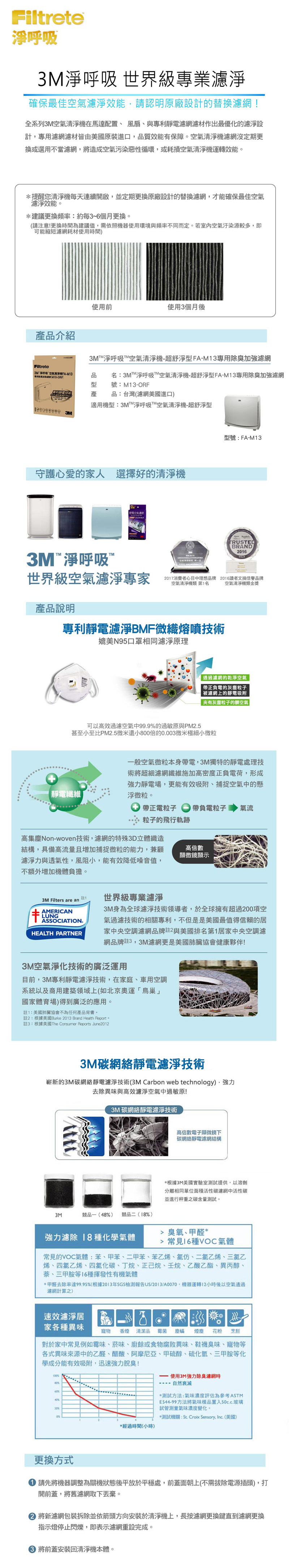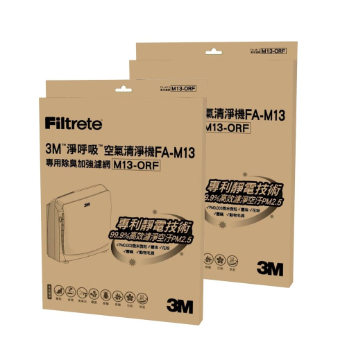 3M 超舒淨型空氣清淨機FA-M13專用除臭加強濾網(2入組) ◆內含FA-M13空氣清淨機專用可選購之除臭加強靜電濾網一片 ◆運用嶄新研發的劃時代濾淨技術,3M碳網絡靜電濾網技術結合了獨特靜電處理的濾網纖維混紡活性碳顆粒,最優化的濾網結構設計兼具強力去除異味與高效濾淨空氣中過敏物質的優異效能 ◆濾網單位面積含碳量大幅超越市面上一般標榜去味的活性碳濾網,加上運用3M獨特的混紡微織熔噴技術,除臭效果效能優異 ◆對於家中常見例如霉味、菸味、廚餘或食物腐敗異味、鞋襪臭味、寵物等各式異味來源中的乙醛、醋酸、阿摩尼亞、甲硫醇、硫化氫、三甲胺等化學成分能有效吸附,迅速強力脫臭 ◆可強力去除18種化學氣體包含臭氧與甲醛,還有居家環境中常見的揮發性有機化合物(VOC氣體):苯、甲苯、二甲苯、苯乙烯、氯仿、二氯乙烯、三氯乙烯、四氯乙烯、四氯化碳、丁烷、正己烷、壬烷、乙酸乙酯、異丙醇、奈、三甲胺等16種揮發性有機氣體 ◆搭載正負電荷的靜電濾網纖維則可以高效濾除空氣中如塵埃、花粉、塵蹣、寵物毛屑等過敏原與病菌 ◆針對最常見於家中如塗料、清潔劑、黏著劑中的VOC化學揮發物-甲苯,3M強力除臭濾網的甲苯去除率領先他牌高達5倍以上 ◆濾網可連續使用2,160個小時,以平均一天使用12小時,約可使用6個月 ◆濾網材質為3M美國原裝進口 ★本商品一經拆封使用,除產品本身瑕疵,恕無法辦理退貨★ ◆濾網型號:M13-ORF ◆適用機型:FA-M13 ◆尺寸:27.9 x 37 x 5 cm ◆重量:616 g ◆國際條碼:4710367434375 ◆產地:台灣 (濾網材質自美國進口) ◆效期:3年