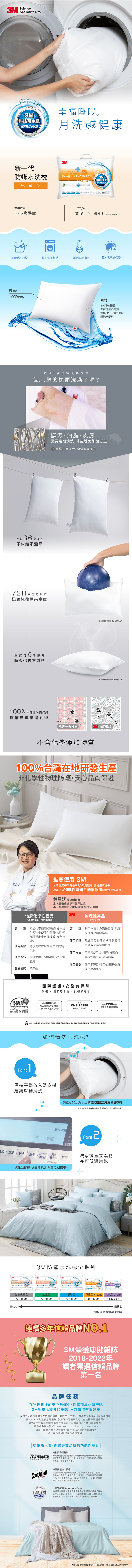 3M 新一代防蹣水洗枕-兒童型(附純棉枕套) ★新一代全面升級!內附純棉枕套更貼心,36次水洗機烘不糾結,月洗越健康!★ 科技可水洗枕心 ◆水洗升級:創新水洗技術,可機洗機烘36次不糾結,月洗越健康 ◆舒適升級:獨特柔軟纖維,包覆性佳更安心 ◆支撐升級:絕佳彈性纖維,蓬鬆度高更舒適 ◆透氣性升級:獨特透氣孔徑,快速排濕超乾爽 100%防蹣表布 ◆防蹣保證:通過TTRI紡研所塵蹣阻隔測試,100%物理性永久防蹣 ◆透氣舒適:高密度編織,常保透氣與舒適 ◆安全認證:通過國際檢測,無毒安心又健康 品質認證 ◆通過SGS測試,符合歐盟REACH標準,不含SVHC高關注物質 ◆符合CNS15290紡織品安全規範 ◆台灣製造MIT,品質值得信賴 ◆市售真正可重複水洗的纖維枕心 ★本商品屬個人用品,一經拆封使用,恕無法辦理退貨★ ◆枕心尺寸:55*40 cm (±5%) ◆包裝尺寸:49*30*5 cm ◆重量:630 g ◆材質:100%聚酯纖維 ◆產地:台灣 ◆產品條碼:4710367436362 ■依照消費者保護法規定,消費者均享有產品到貨七天猶豫期之權益,但退回產品必須是全新狀態且包裝完整 ( 保持產品、附件、包裝、廠商紙箱及所有附隨文件或資料之完整性 ) ,否則恕不接受退貨 ■本產品一經拆封使用過後,若非產品本身瑕疵,恕無法辦理退換貨 ■本產品文案為原廠所提供,若有變動敬請參照實際商品為準 ■本產品網頁因拍攝關係,圖檔略有差異,實際以廠商出貨為主 ■本產品係由生產廠商或供應商免費提供基本運送, 若因地處偏遠、或其他特殊情形 (例如:天災或道路狀況不良),致使所屬物流車輛無法於正常狀況下送抵,而需另以其他方式處理時,所衍生之費用,須由訂購人自行支付供貨廠商 ■配送地點:僅限台灣本島,如外島配送請務必先與廠確認運費。