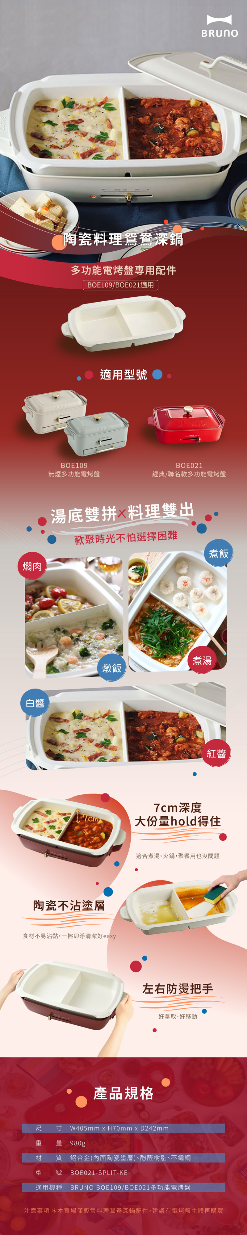◆需搭配BRUNO BOE109 無煙多功能電烤盤或BRUNO BOE021 經典/聯名款多功能電烤盤使用。