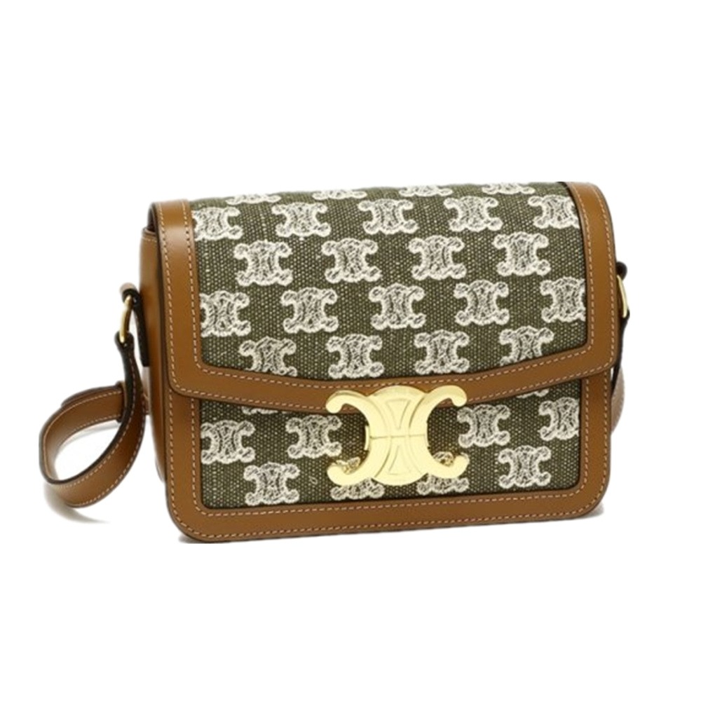 品名 : 【CELINE 思琳】CELINE 老花牛仔帆布 棕皮革飾邊 斜背包 [綠]