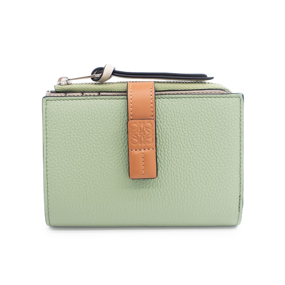 品名 : 【LOEWE 羅威】 LOEWE 粒面小牛皮拼色L拉鍊雙折短夾 迷迭香/棕褐