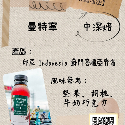 參考風味 : 堅果、胡桃、牛奶巧克力(中深焙)半磅400元(一磅780元)單包濾掛35元