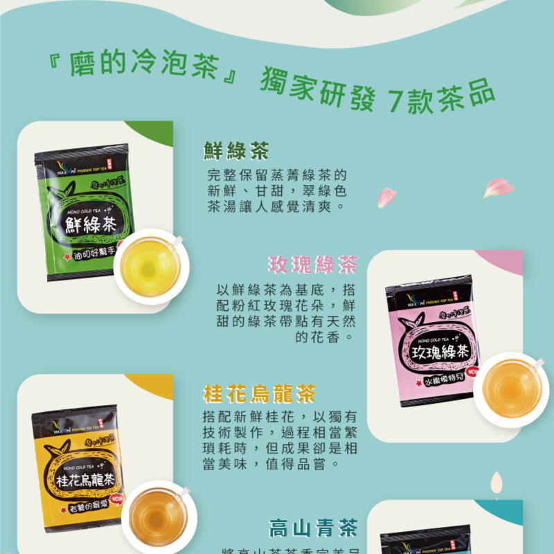 多口味多風味,目前有7種冷泡茶品,都是獨家研發供應。