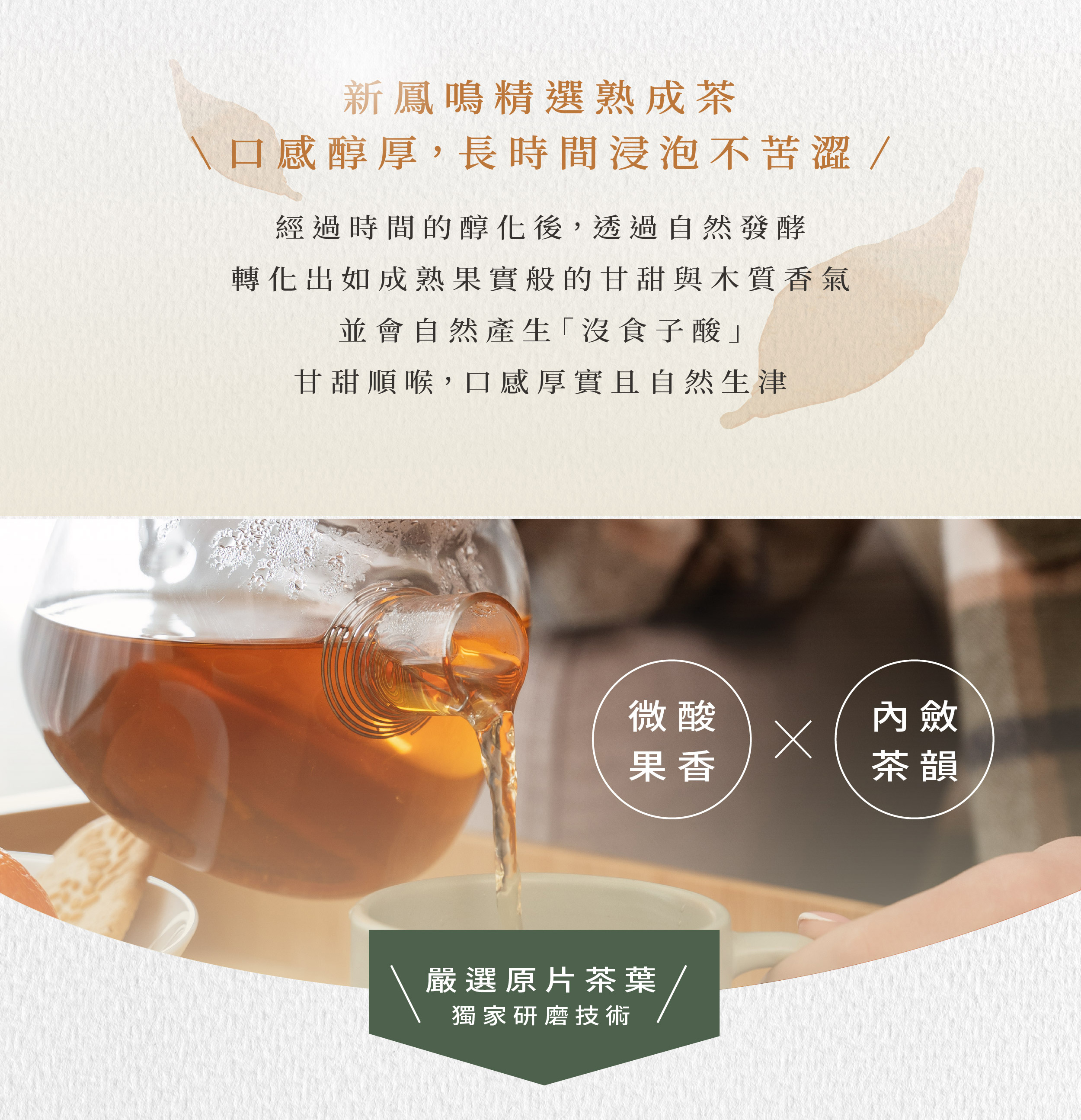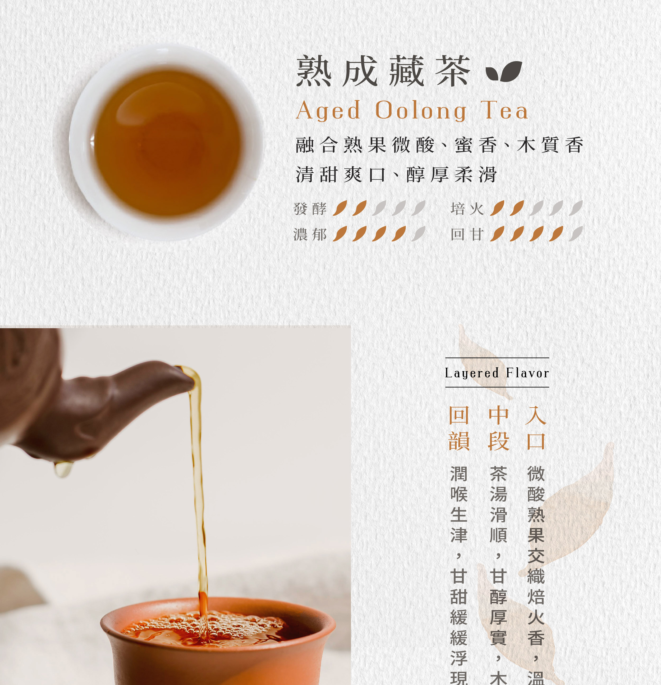 經過時間熟成的茶葉,透過自然發酵轉化出如成熟果實般的甘甜與木質香氣,並會自然產生「沒食子酸」,茶湯溫潤甘醇,口感厚實且自然生津。