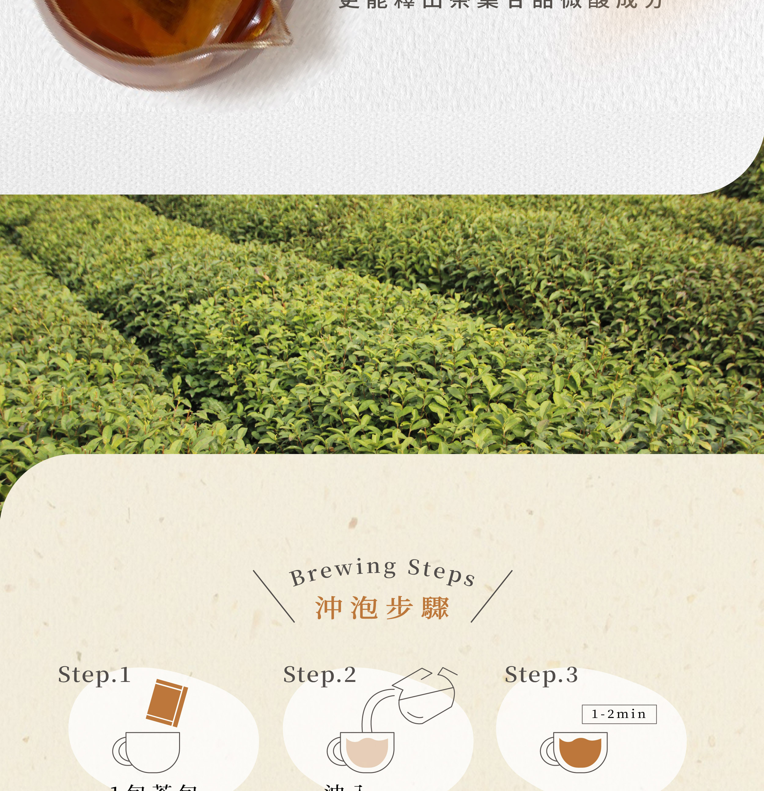 沖泡方式:取1包,沖泡約300cc熱水,浸泡約1-2分鐘即可飲用,可反覆回沖多次。