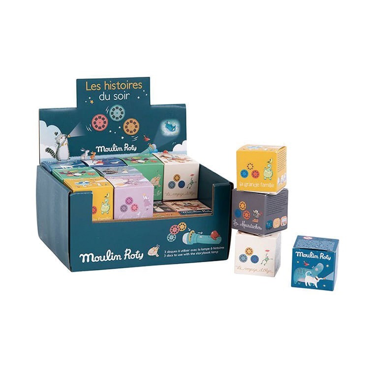 法國品牌 Moulin Roty 手電筒系列 - 故事投影片。小孩最喜歡的故事手電筒系列,將無趣的睡前故事變成夢幻小劇院! Moulin Roty 很貼心的推出了一系列的故事投影片,家長們甚至只要買一組手電筒,再加購孩子喜歡的故事主題就好喔!故事內容沒有順序的規定、也沒有字幕的限制,小孩子愛怎麼說、就怎麼說!促進孩子的表達能力及想像力的發展!