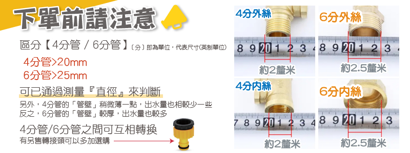 👉測量水龍頭,請先判斷水龍頭為「內牙」、「外牙」還「無牙」
