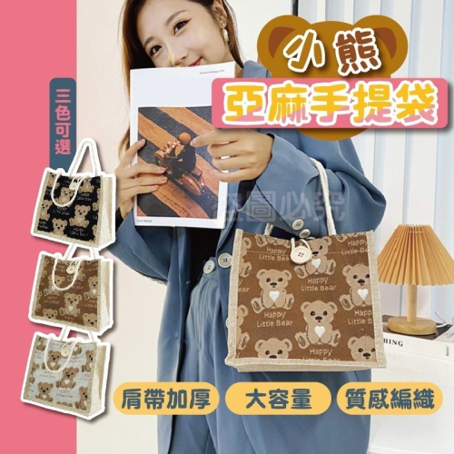 可愛小熊圖案亞麻編織手提袋,耐磨耐用🧸