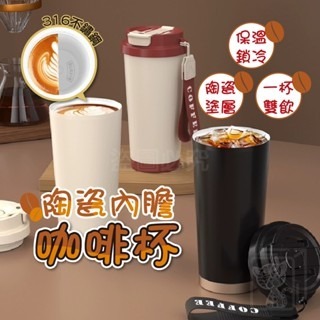 🔥一蓋雙飲🔥陶瓷保溫咖啡杯 陶瓷保溫瓶 咖啡保溫杯 316不鏽鋼 530ml 吸管保溫杯 隨行杯 陶瓷塗層杯