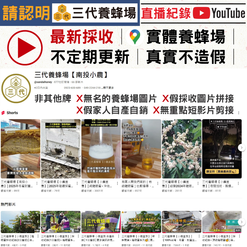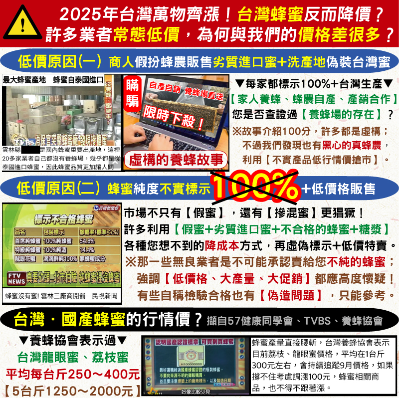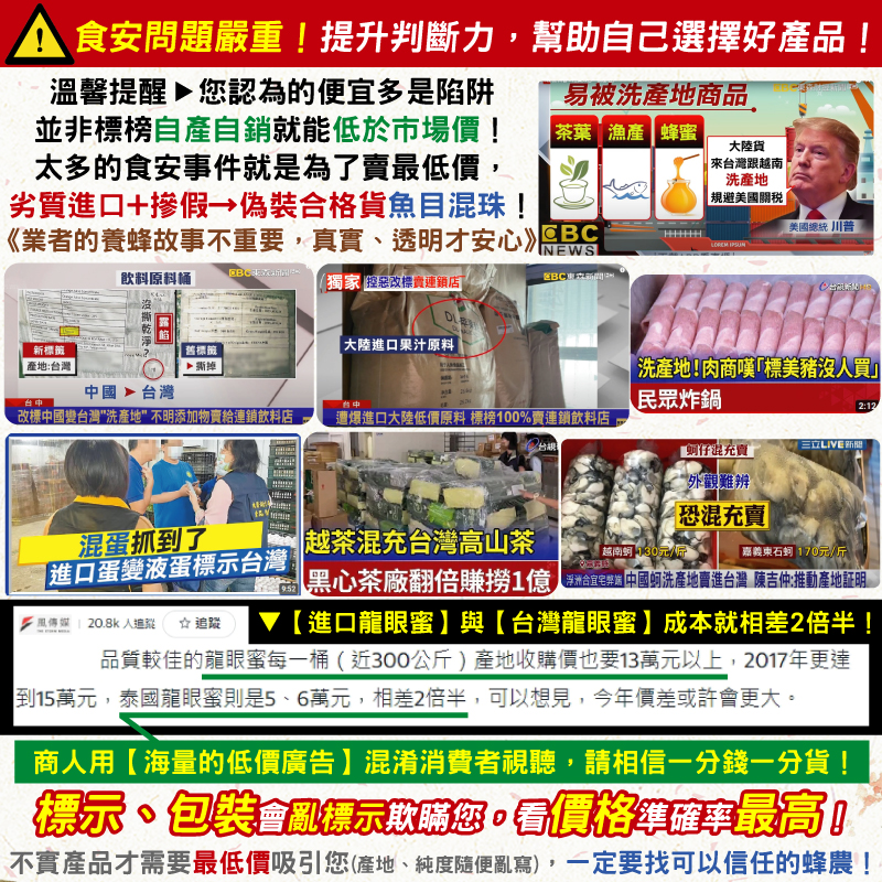 市面非常多【低價產品】都是【來源不明的劣質進口貨】並交由【工廠摻混+美化包裝+洗產地+台灣出貨】,再包裝成【家人自產自銷、蜂農自售、產銷合作】,【開設多家品牌賣場】搏版面;隨便5家有4家【模仿得像蜂農】,實際卻是【幽靈養蜂場】,就算給您特殺的價格,真的能吃得安心嗎❓