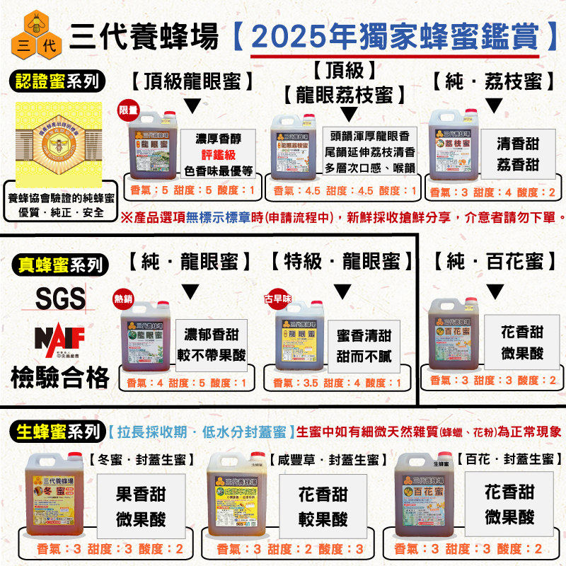 2.荔枝、龍眼短季節性的蜜源有生蜜,但水分通常都會偏高較不易保存,短期內須食用完畢。