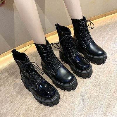 跟高:6公分 鞋面材質:PU 后跟高:高跟 鞋底材質:橡膠 靴款品名:馬丁靴 幫高筒高:中筒 閉合方式:前系帶 跟底款式:松糕底 風格:韓版