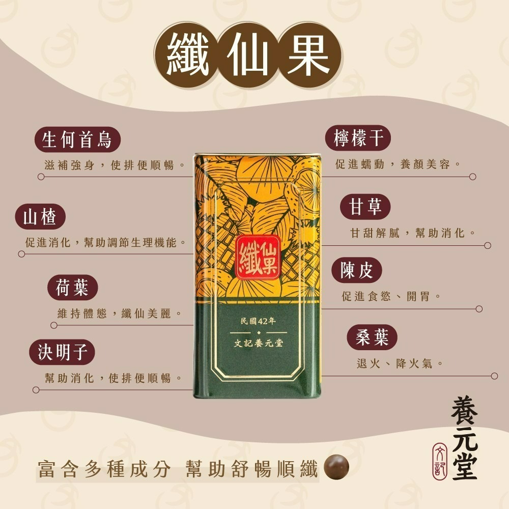 養元堂推出的第三支生活漢方GMP廠食品系列,高達10種天然成分的纖仙果,小小一顆讓你開啟通透世界!文創感十足的包裝方便攜帶,百分百台灣GMP廠的生產線製造