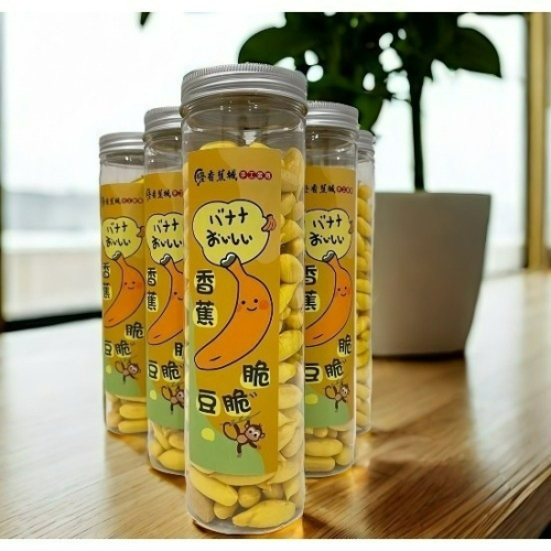 [香蕉脆脆豆]  使用樹薯澱粉、奶油等材料加入旗山香蕉噴霧製成的天然香蕉果汁粉糊化成麵糊,擠壓成