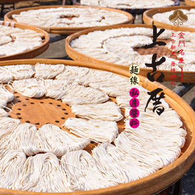 金門麵線之所以有名,是因為它是以手工製成的,韌性十足,並引用金門獨特純淨的水質,配合得天獨厚的氣候,並經由「風」和「陽光」自然乾燥。所以,即使沒有添加物或防腐劑,任意存放而不會變質。 上古厝麵線除了秉持傳統的方法製作外,更是重視接、掛、甩、搧,一氣呵成的工夫。吃起來也特別細緻、Q柔而沒有鹹味。為將金門手工傳統麵線的特色發揚光大,上古厝以多元化生產方式,在麵線種類上,堪稱金門第一。 除傳統的原味麵線之外,養生系列的海菜、南瓜、芋頭、紅棗、高梁、紫山藥等麵線,口味不僅與眾不同,而且兼具健康概念。 更難得的是上古厝還將金門過去富豪人家,所獨自精心調配的私房麵線醬料以現代化的生產技術研發上市,這也是【上古厝麵線】比別家專業,更受歡迎的原因