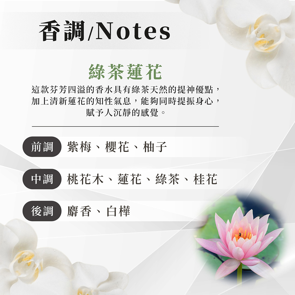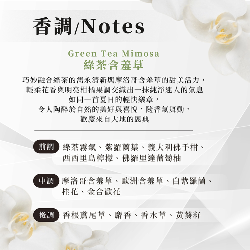 前 味:義大利佛手柑、綠茶香調、西西里柑橘、香櫞萃取
