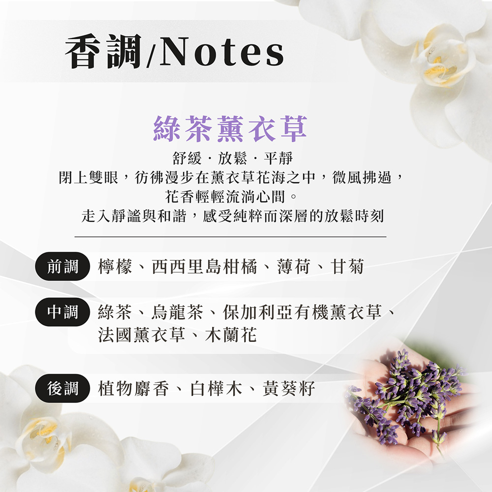 中 味:法國薰衣草、 保加利亞薰衣草、 烏龍、 綠茶