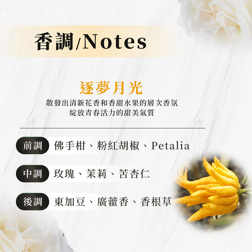 中 味:白阿爾巴玫瑰、Mahonial™、保加利亞玫瑰精油、雙瓣茉莉