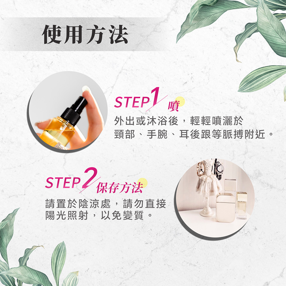 ★使用方式:直接噴撒於手挽內側或耳後肌膚,即可享受芳香。