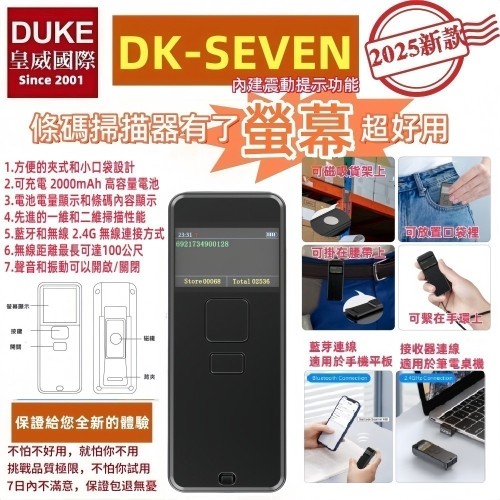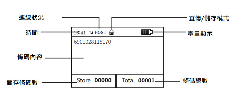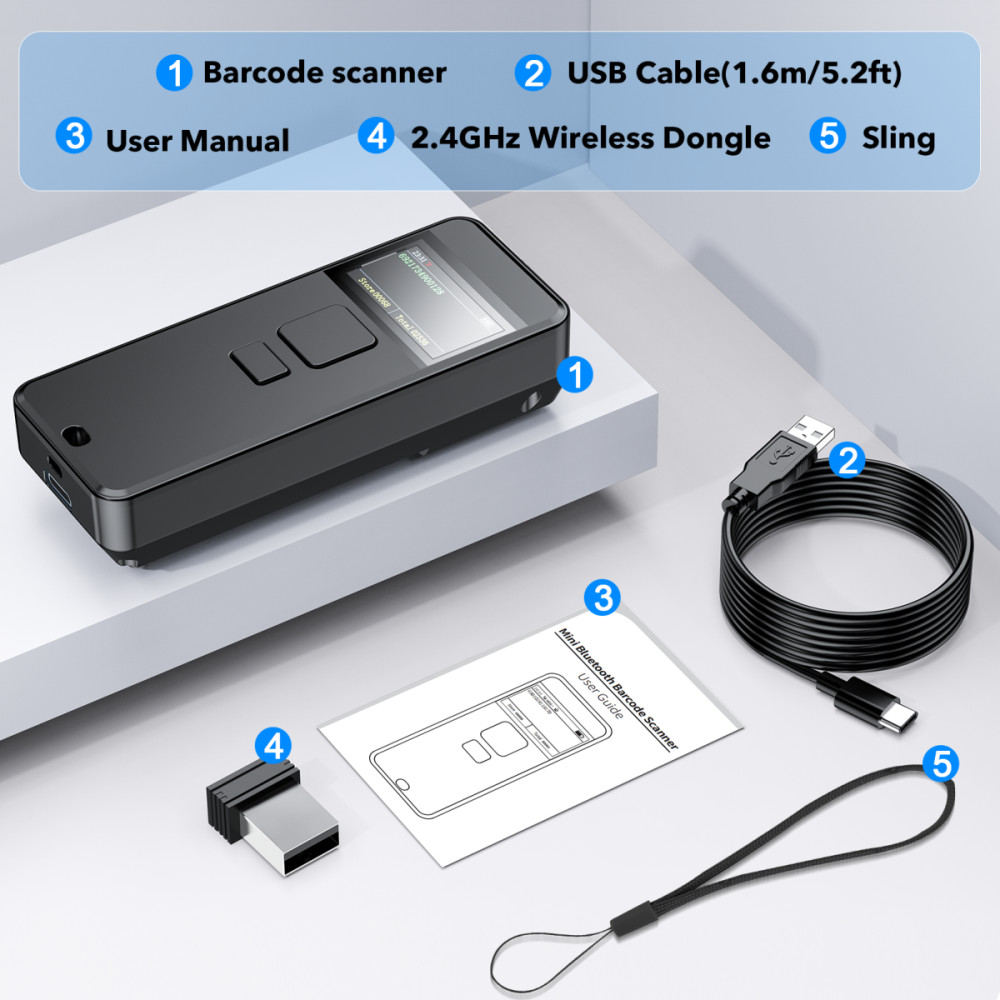 這款無線條碼掃描器配備1.5吋LCD螢幕,可顯示許多訊息,如掃描時間、連接方式(藍牙、2.4GHz無線或USB有線)、電池電量、條碼資料、商品名稱、商品價格、儲存資料量和總掃描量。