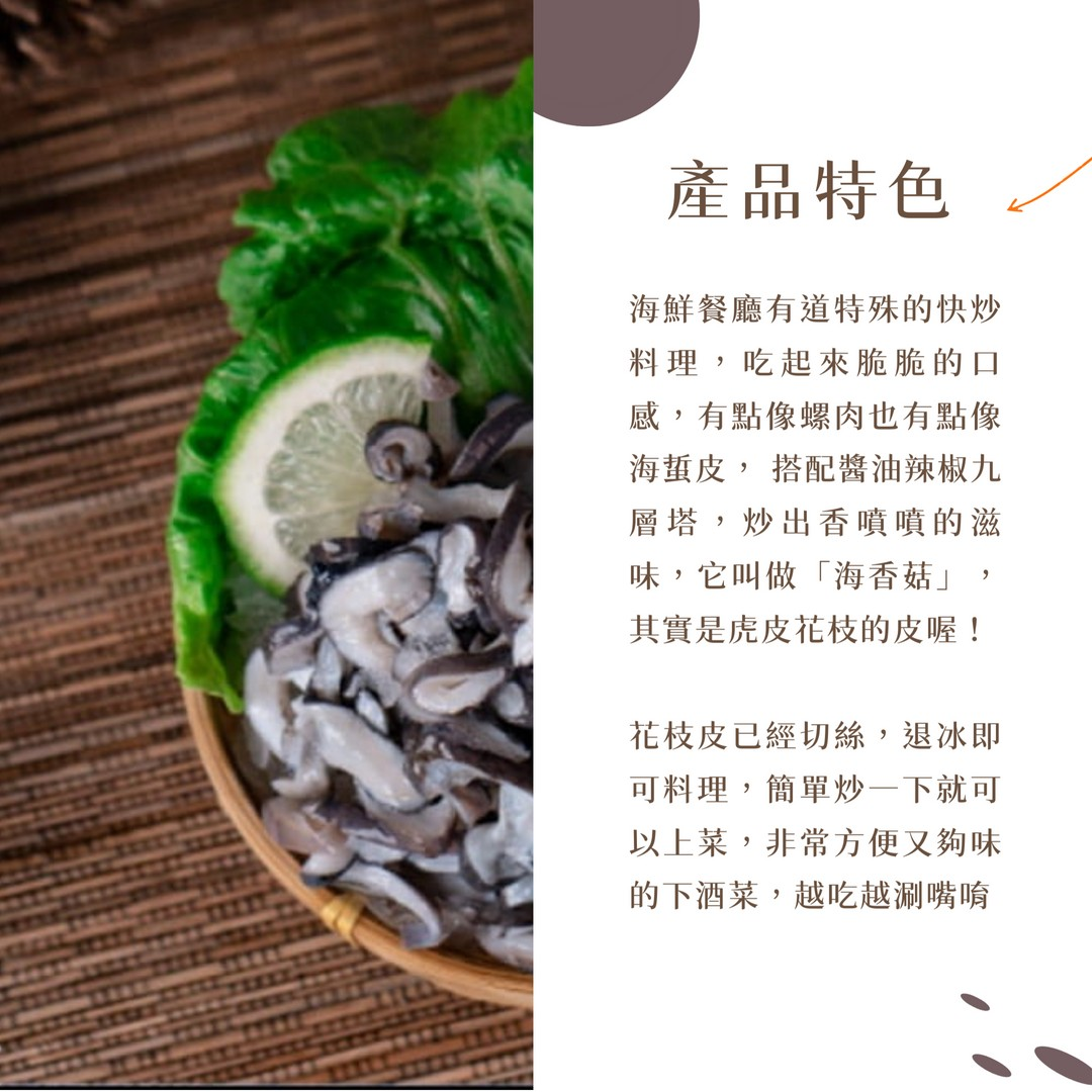 海鮮餐廳有道特殊的快炒料理,吃起來脆脆的口感,有點像螺肉也有點像海蜇皮, 搭配醬油辣椒九層塔,炒出香噴噴的滋味,它叫做「海香菇」,其實是虎皮花枝的皮喔! 花枝皮已經切絲,退冰即可料理,簡單炒一下就可以上菜,非常方便又夠味的下酒菜,越吃越涮嘴唷!