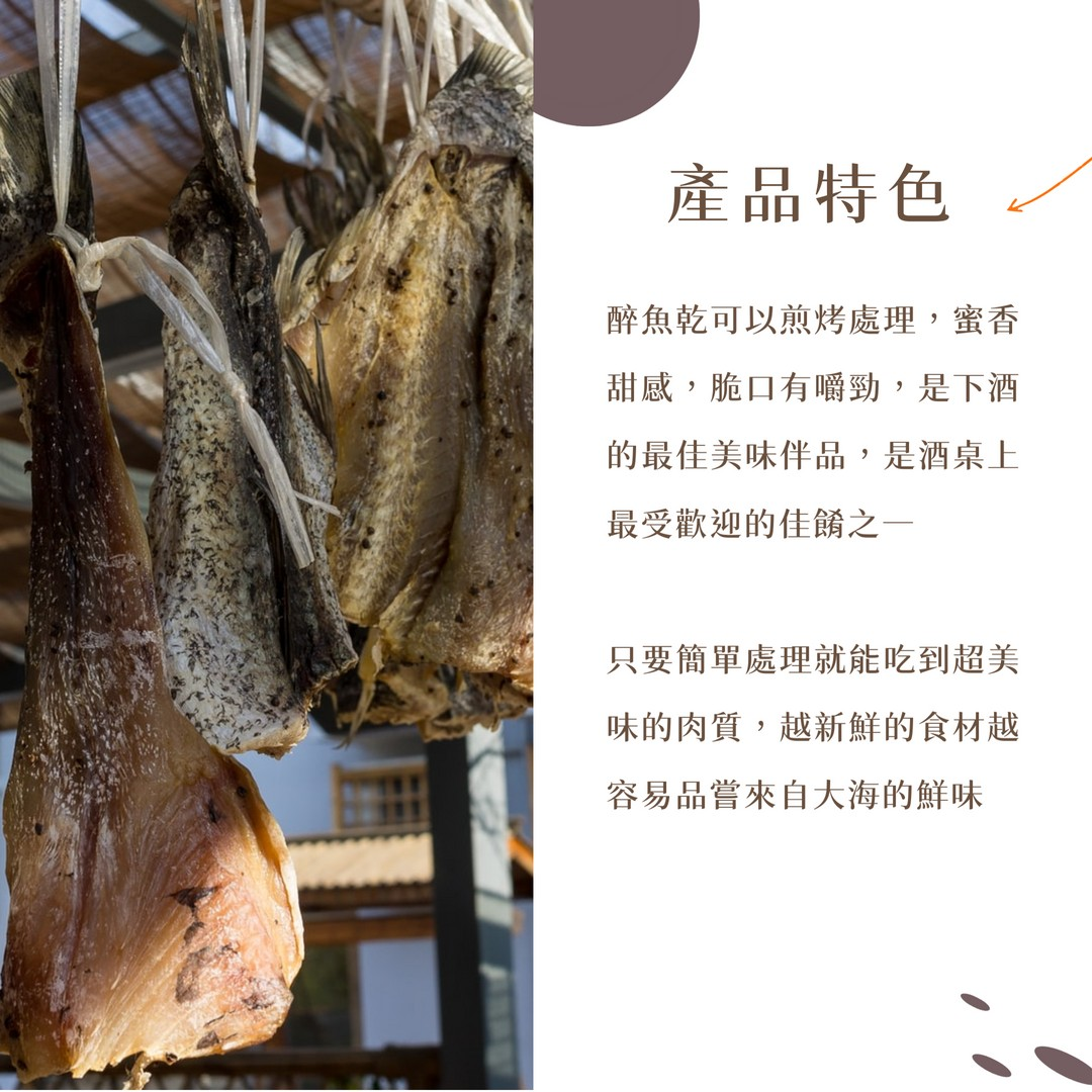 醉魚乾可以煎烤處理,蜜香甜感,脆口有嚼勁,是下酒的最佳美味伴品,是酒桌上最受歡迎的佳餚之一, 只要簡單處理就能吃到超美味的肉質,越新鮮的食材越容易品嘗來自大海的鮮味。