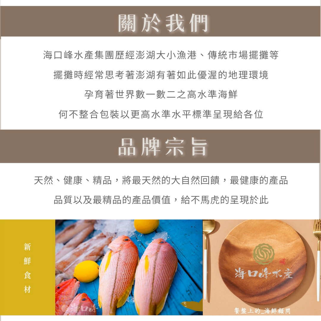 海口峰水產集團,將澎湖海鮮之鮮甜海味完整保留,讓大家看得見對於品質的要求及堅持,做到的不只是精品行銷,更是想讓各地都能看得見澎湖,都能感受到澎湖這片幸福海洋所賦予的幸福滋味,是一種堅持 < 對 > 的態度,現代人對於自己太過嚴苛,購買海鮮食材時,不斷的比價顧及便宜,買進各種廉價海鮮節省開銷,而卻逐漸忘了食材本身的健康與價值,而作為顧問式海鮮品牌「海口峰水產集團」致力於通過各種認證檢驗,幫助更多家庭可以吃到最天然、最鮮美、最健康的澎湖海鮮。