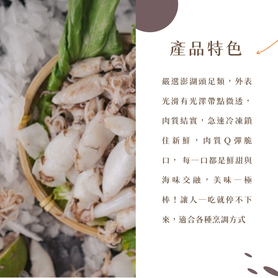 嚴選澎湖頭足類,外表光滑有光澤帶點微透,肉質結實,急速冷凍鎖住新鮮,肉質Q彈脆口, 每一口都是鮮甜與海味交融,美味一極棒!讓人一吃就停不下來,適合各種烹調方式。