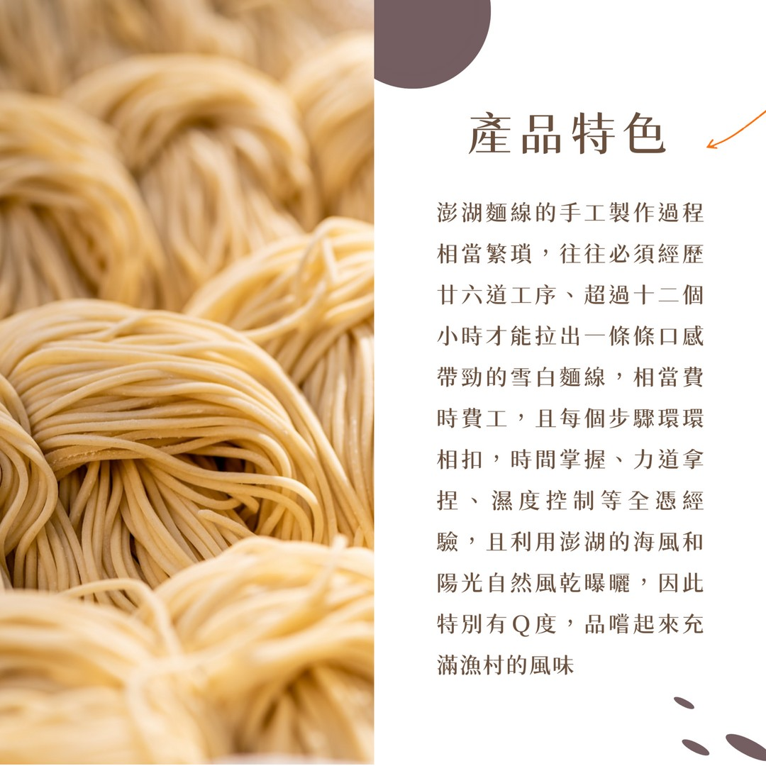 澎湖手工麵線已有百年以上歷史,其中以馬公西衛產量較大,相對較有名聲。 澎湖麵線的手工製作過程相當繁瑣,往往必須經歷廿六道工序、超過十二個小時才能拉出一條條口感帶勁的雪白麵線, 相當費時費工,且每個步驟環環相扣,時間掌握、力道拿捏、濕度控制等全憑經驗 ,且利用澎湖的海風和陽光自然風乾曝曬,因此特別有Q度,品嚐起來充滿漁村的風味。 ✔✔✔由於商品為冷凍運送,收到貨後請儲存於冷藏,避免商品變質!!