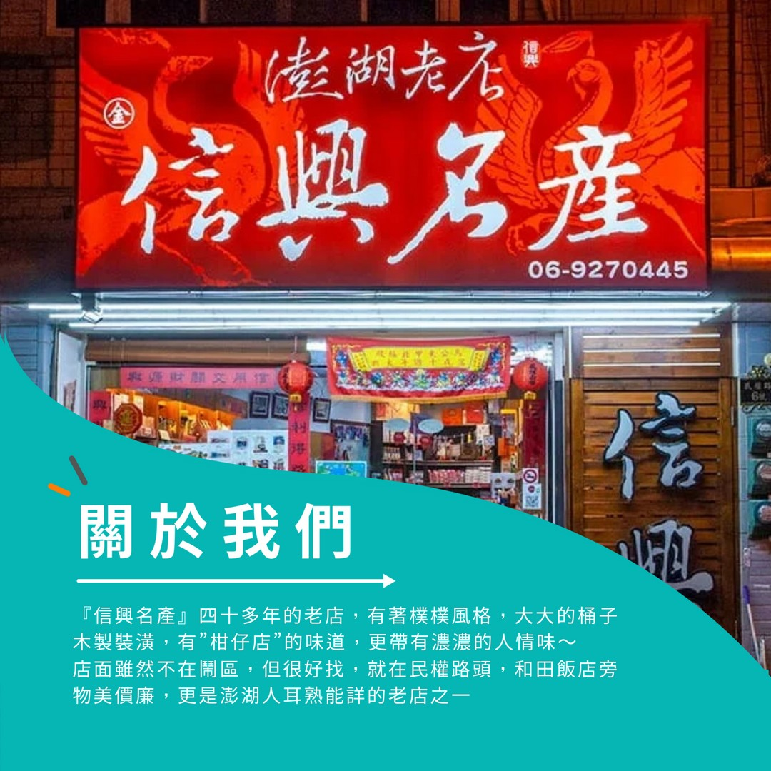 『信興名產』四十多年的老店,有著樸樸風格,大大的桶子,木製裝潢,有”柑仔店”的味道,更帶有濃濃的人情味,三位大方的老板娘以及熱情的員工,不怕您試吃,一買成主顧,店面雖然不在鬧區,但很好找,就在民權路頭,和田飯店旁,物美價廉,更是澎湖人耳熟能詳的老店之一。