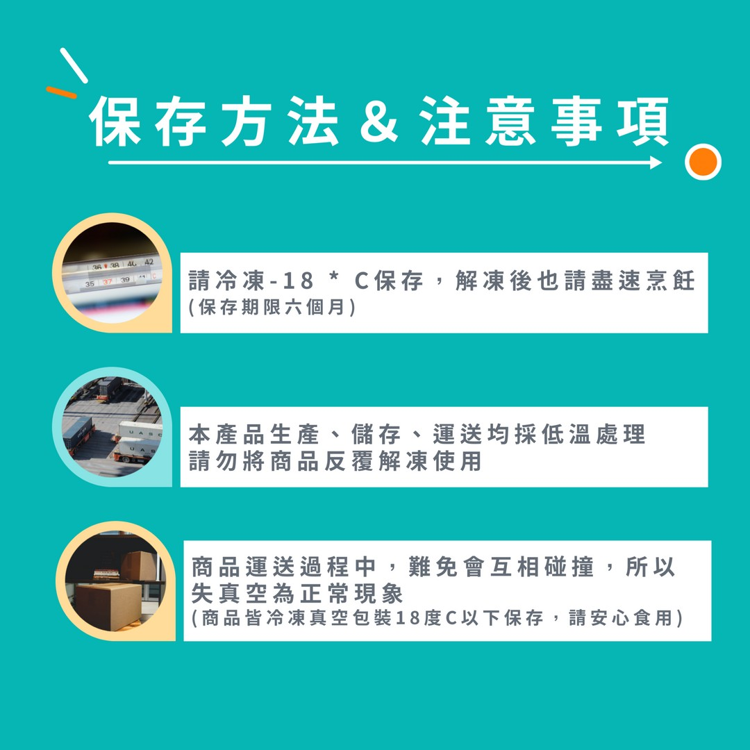 保存方式:請冷凍-18 * C保存解凍後請盡速烹飪 (保存期限六個月)