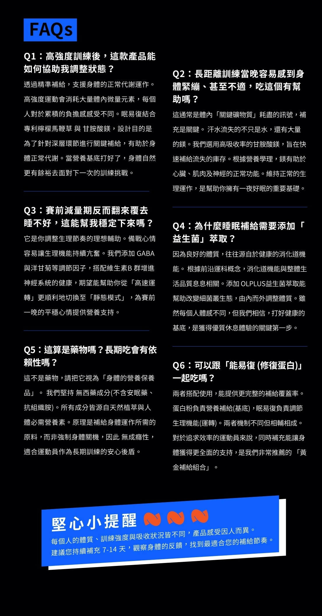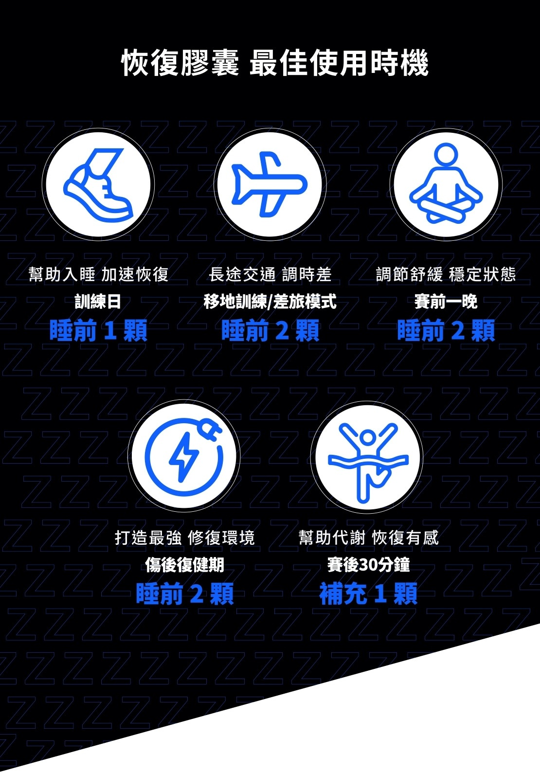 建議食用方式:每日睡前一小時一顆;加強保養:訓練後一顆、睡前一小時一顆