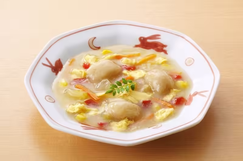 成份: 蔬菜(大白菜、胡蘿蔔、玉米、甜椒、薑)、蝦丸[蝦、阿拉斯加鱈魚、玉米澱粉、馬鈴薯泥、蛋白、食鹽、蝦粉、蝦醬(蝦、食鹽)]、雞蛋、玉米澱粉、雞肉萃取粉(雞肉、小麥、大豆、牛奶)、大豆油、油菜籽油、芝麻油、鰹魚萃取粉、砂糖、酵母萃取粉、食鹽、昆布萃取粉、白胡椒、調味劑(L-麩酸鈉、5’-次黃嘌呤核苷磷酸二鈉、5’-鳥嘌呤核苷磷酸二鈉、檸檬酸鈉、胺基乙酸、DL-胺基丙酸、琥珀酸二鈉、磷酸二氫鉀、琥珀酸)、蛋殼鈣、檸檬酸鈉、葡萄糖酸鈉、碳酸鉀(無水)、碳酸氫鈉、開水