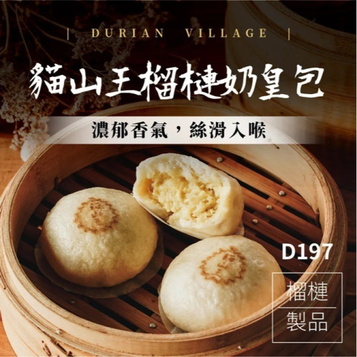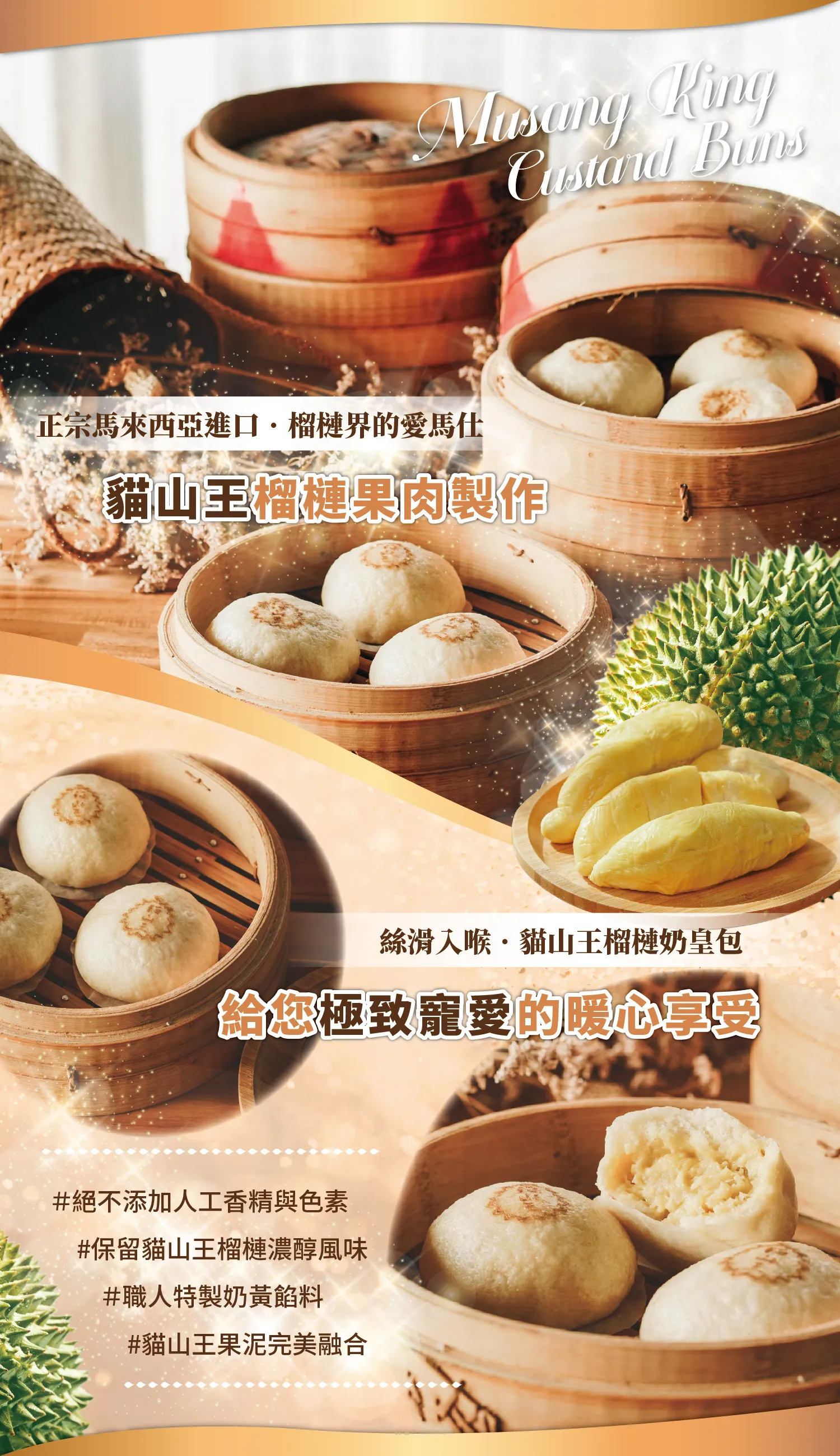 使用馬來西亞進口貓山王榴槤果泥與職人特製奶黃餡料完美融合,配上手工老麵Q彈外皮,一款絲滑入喉、榴槤香氣濃郁誘人的人間美味包子就誕生了!