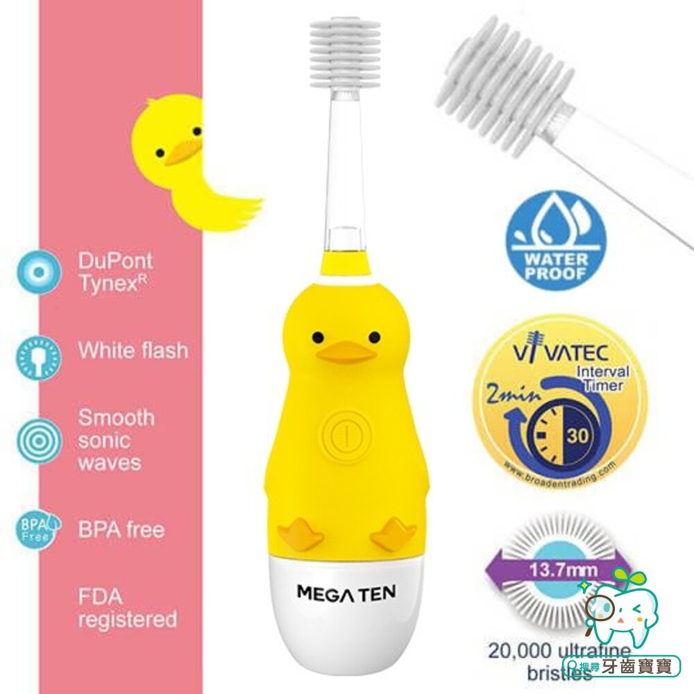 商品名稱:頂級款 Vivatec 創新升級‧5倍清潔力 Mega Ten 360度幼童電動牙刷(小鴨)