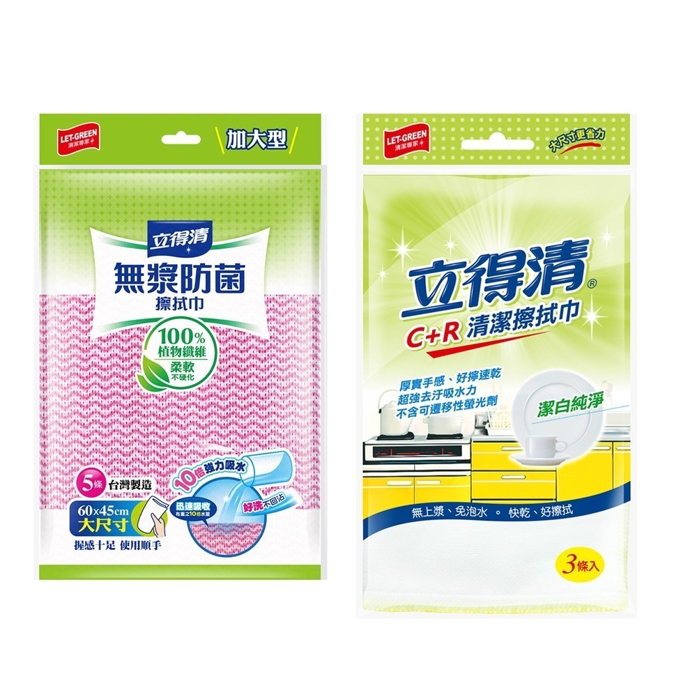 立得清無漿防菌抹布-10倍強力吸水 加大款(5條包)/ (C+R)棉紗抹布-快乾型 厚實無紡布(3條包)