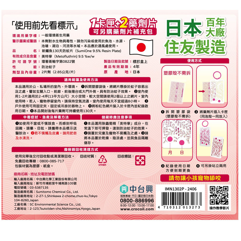 - 新鱷魚130天防蚊片許可證字號:環署衛輸字第0822號