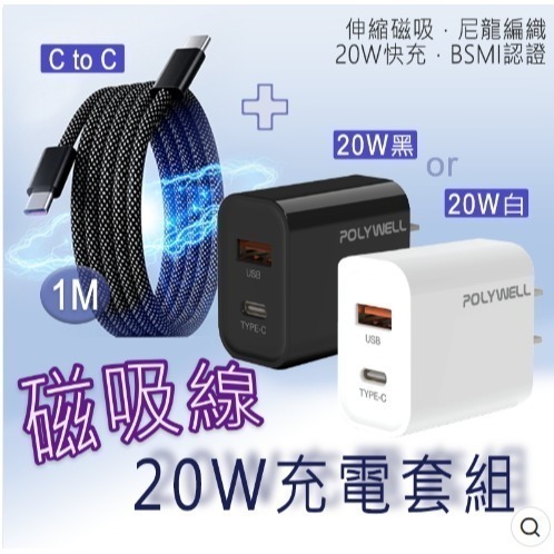 PD雙孔充電頭 (USB+Type-C)+磁吸編織快充線C-C
