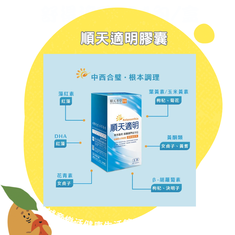 馬鈴薯澱粉、麥芽糊精、枸杞、女貞子、非基改紅藻(含藻紅素Astaxanthin)、菊花、決明子、當歸、白芍、熟地、二氧化矽、樹薯澱粉、黃耆