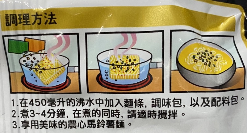 麵:馬鈴薯澱粉,小麥粉,棕櫚油,小麥麵筋,馬鈴薯粉,鹽,品質改良劑(碳酸鉀,磷酸氫二鈉,碳酸鈉),抗氧化劑(維生素E),調味粉[麥芽糊精,大蒜,甜味劑(D-山梨醇)],著色劑(核黃素)。