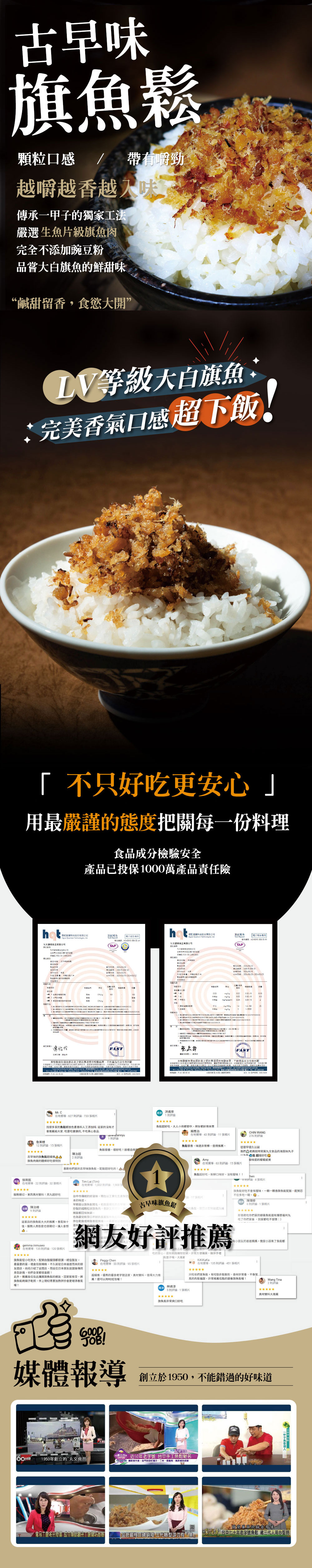 • 全台首創無添加豆粉、香精、色素的旗魚鬆,吃的到大白旗魚純粹的香氣,保證越嚼越香,食慾大開。