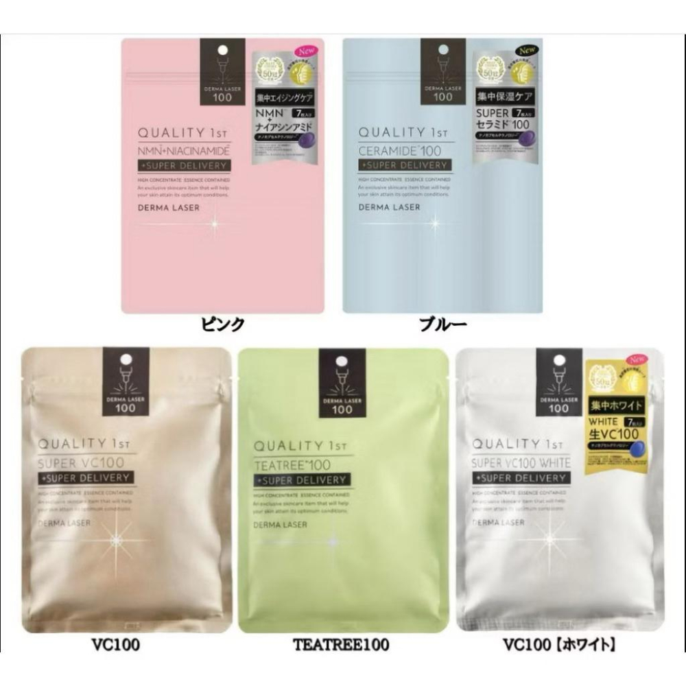 【DERMA LASER超亮白潤澤面膜7枚】(金色包裝) ●富含維他命C,給予肌膚透亮 ●不織棉布面膜,鎖住大量美容液 ●3分鐘滲入肌底,為肌膚帶來透亮潤澤 【DERMA LASER超鎮靜修復面膜7枚】(綠色包裝) ●含茶樹萃取精華,給予肌膚鎮靜舒緩 ●不織棉布面膜,鎖住大量美容液 ●3分鐘滲入肌底,為肌膚進行舒緩修復  【DERMA LASER超淨透平衡面膜7枚】(粉色包裝) ●富含維他命B3,緊緻肌膚毛孔細紋 ●不織棉布面膜,吸附大量美容液 ●3分鐘滲入肌底,為肌膚帶來透亮彈潤 【DERMA LASER超潤澤面膜7枚】(藍色包裝) ●含多種潤澤成分,使肌膚維持水潤 ●不織棉布面膜,吸附大量美容液 ●3分鐘滲入肌底,為肌膚帶來潤澤 【DERMA LASER超集中亮白潤澤面膜7枚】(銀色包裝) ●含多種維他命C,給予肌膚透亮 ●不織棉布面膜,鎖住大量美容液 ●3分鐘滲入肌底,為肌膚帶來晶亮透潤 【產地】日本 【保存期限】3年 【容量】7入 【用途】臉部保養。 【用法】●取出面膜,對齊眼、口部位置再服貼全臉,靜置3分鐘取下面膜,再將臉部精華液按壓吸收。 【保存方法】勿近火源或置於極端高低溫、潮濕、陽光直射處。 【全成分】依款式不同,詳見商品外包裝 ●請留意膚況使用。不適用、肌膚異常時或出現以下狀況,請停止使用。持續使用會導致肌膚惡化,請盡速諮詢專科醫師。(1)使用中出現紅腫癢、刺激、脫色(白斑)、黑斑等狀況。(2)使用後經陽光照射後,出現上述情形。●若不慎刺激眼部勿搓揉,請以清水沖淨。●本品為一次性使用品。切勿重複使用。●請勿敷著面膜就寢。●請置於嬰幼兒無法取得處。●本品不溶於水,請勿丟棄馬桶內。●開封後請緊閉夾鏈袋,開口朝上存放。