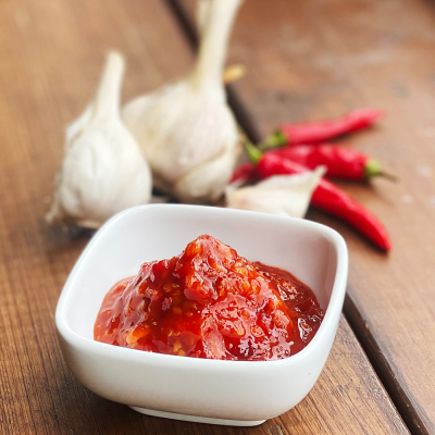 岡山志斌蒜蓉辣椒醬,成份是將新鮮的台灣雲林大蒜,結合自然日曬熟成人力攪醬120天的純辣椒,混合調味成蒜蓉辣椒醬(無豆瓣醬成份)。因為無黃豆,所以口味完全無鹹度,喜歡泰式甜甜辣辣的辣椒醬朋友,會愛上志斌的蒜蓉辣醬。